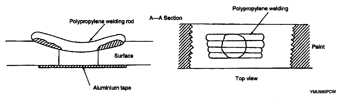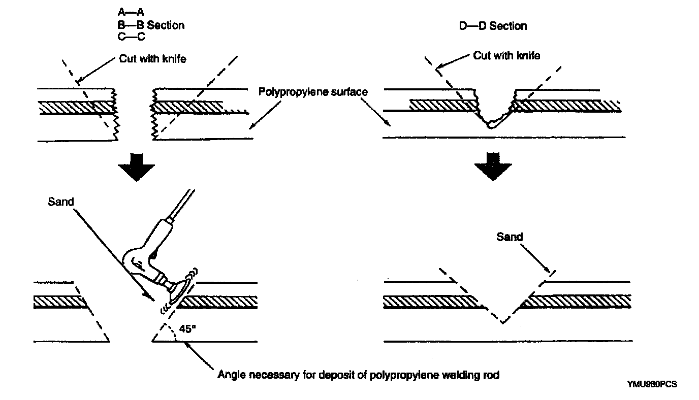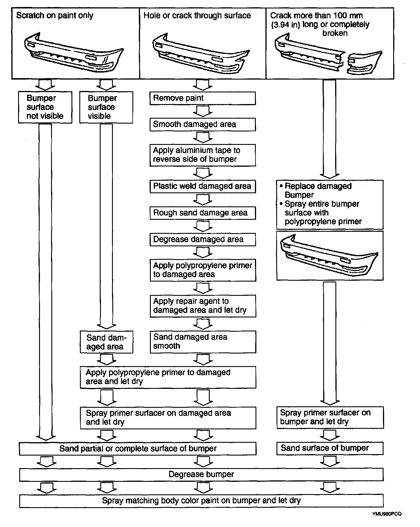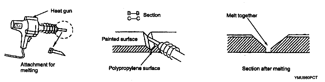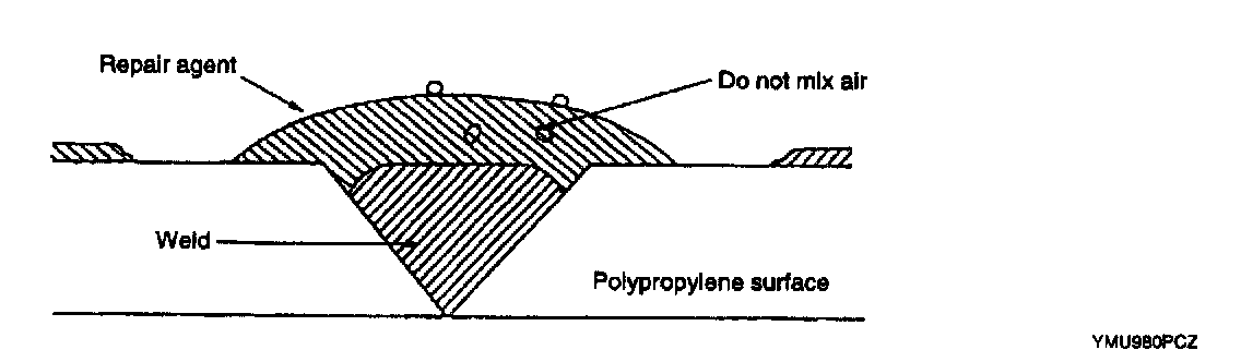When the repair agent hardens, it will provide a good finish with the same flexibility as the polypropylenes. The repair agent for a urethane bumper is also a two part adhesive compound. However, this is different from that for a polypropylene bumper. If the incorrect repair agent is used, the repair will be faulty.