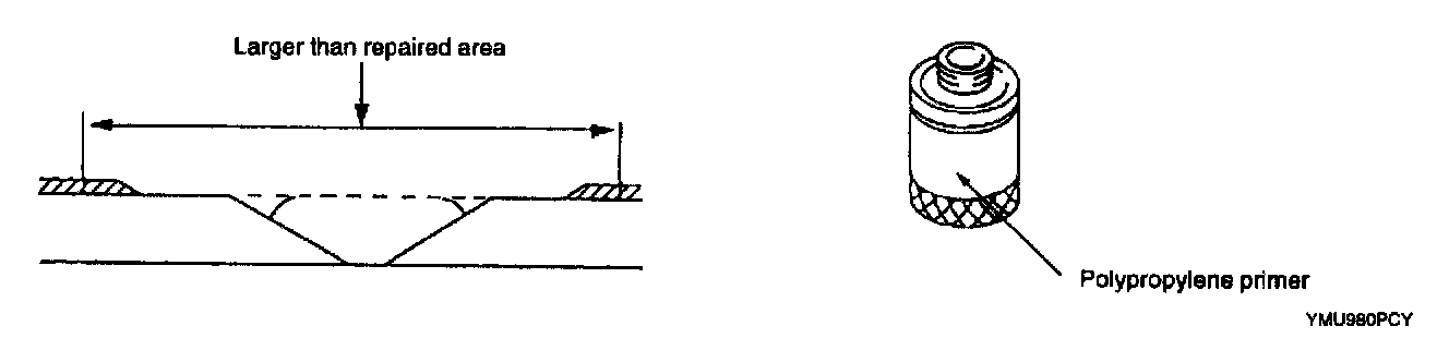 5. Uniformly apply polypropylene primer with a brush to an area larger than the repaired area. Allow to dry about 10 minutes at 20 degree C(68 degrees F).