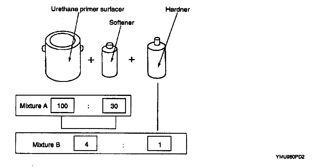1. Mixing method Urethane primer surfacer + Softener..... Mixture A Mixture A + hardener..... Mixture B Dilute mixture B with thinner to spray on bumper