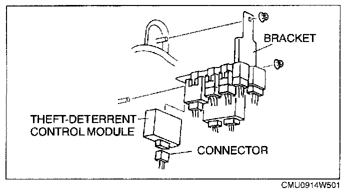 THEFT-DETERRENT CONTROL MODULE REMOVAL/INSTALLATIONNOTE: Because the lock section of the module is damaged easily, do not remove the module from the bracket unless replacement is necessary. Always perform an inspection of the theft-deterrent control module before removal.