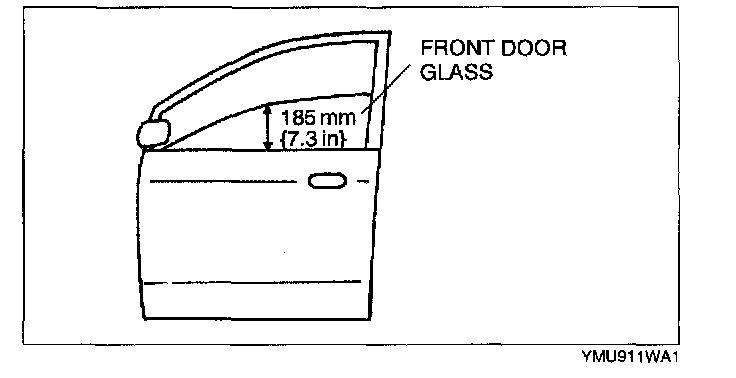 FRONT DOOR GLASS AND GUIDE REMOVAL/INSTALLATION1. Lower or raise the front door glass so that the distance from the top of the front door glass at the rear end to the upper part of the front beltline molding is 185 mm {7.3 in}.