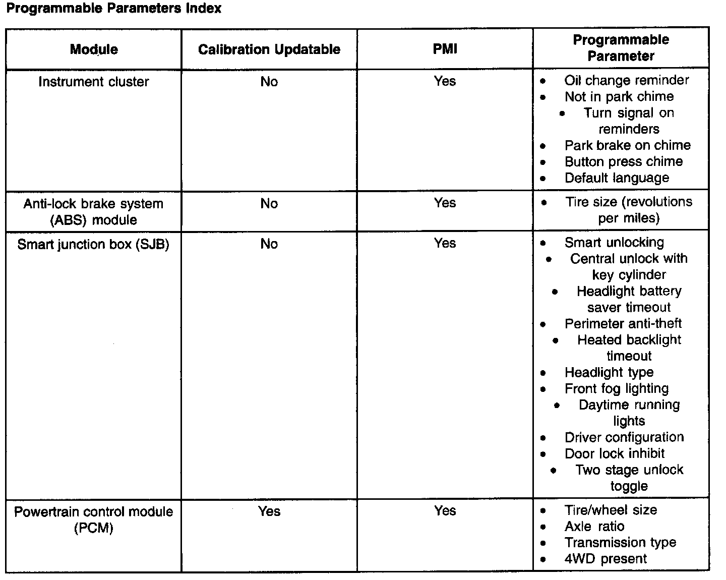 Programmable Parameters: These are options contained within the existing software. These include items such as tire size, customer preference items and anti-theft options. The current settings are downloaded from an existing module then uploaded to a new module. They can also be configured using the diagnostic tool. Programming parameters is very different from updating calibrations as no software is changed, only the options already contained in the software.
