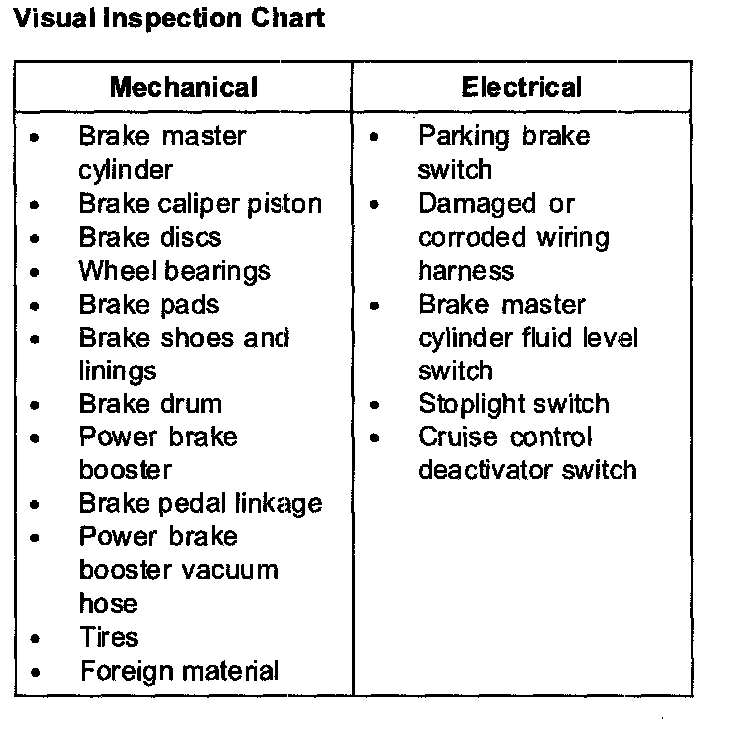 Changes in brake pedal feel or travel are indicators that something could be wrong in the brake system. See SYMPTOM TROUBLESHOOTING CHART CONVENTIONAL BRAKE SYSTEM for abnormal condition diagnosis. Symptom Related Diagnostic Procedures