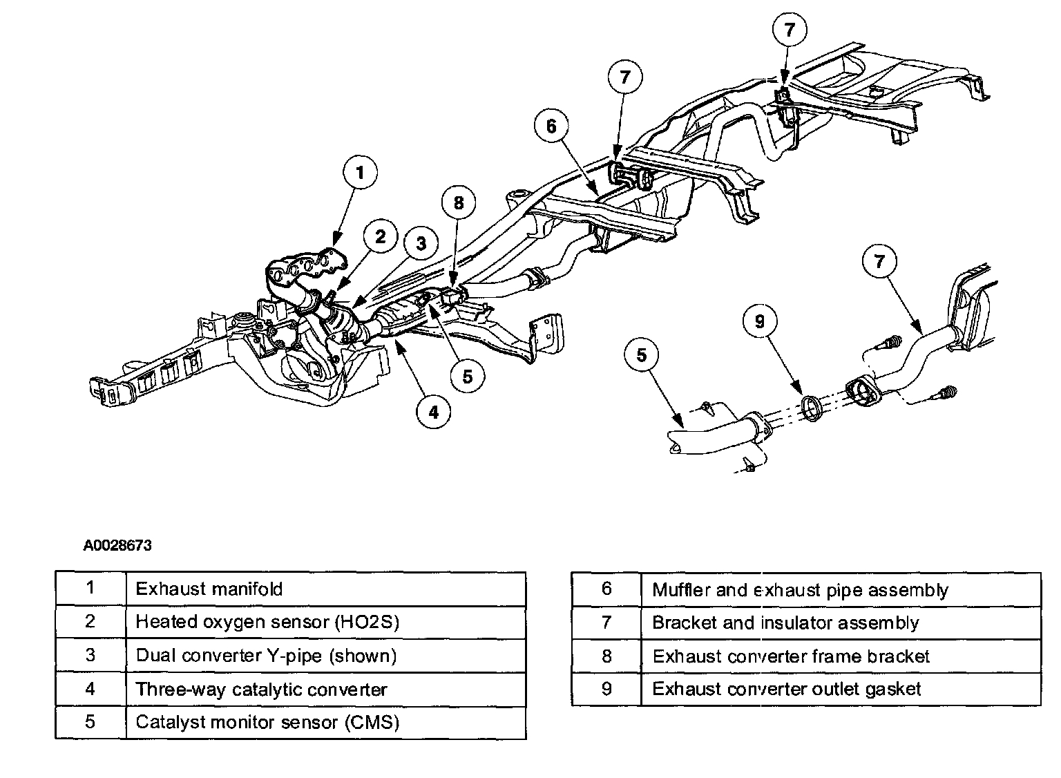 The purpose of the exhaust system is to convey engine emissions from the exhaust manifold to the atmosphere. Engine exhaust emissions are directed from the engine exhaust manifold to the catalytic converter through the front exhaust pipe. A Heated Oxygen Sensor (HO2S) is mounted on the front exhaust pipe before the catalyst. The catalytic converter reduces the concentration of carbon monoxide (CO), unburned hydrocarbons (HCs), and oxides of nitrogen (NOx) in the exhaust emissions to an acceptable level. The reduced exhaust emissions are directed from the catalytic converter to a muffler through the rear exhaust pipe. Another HO2S is mounted on the rear exhaust pipe. Lastly, the exhaust emissions are directed to the atmosphere through an exhaust pipe.