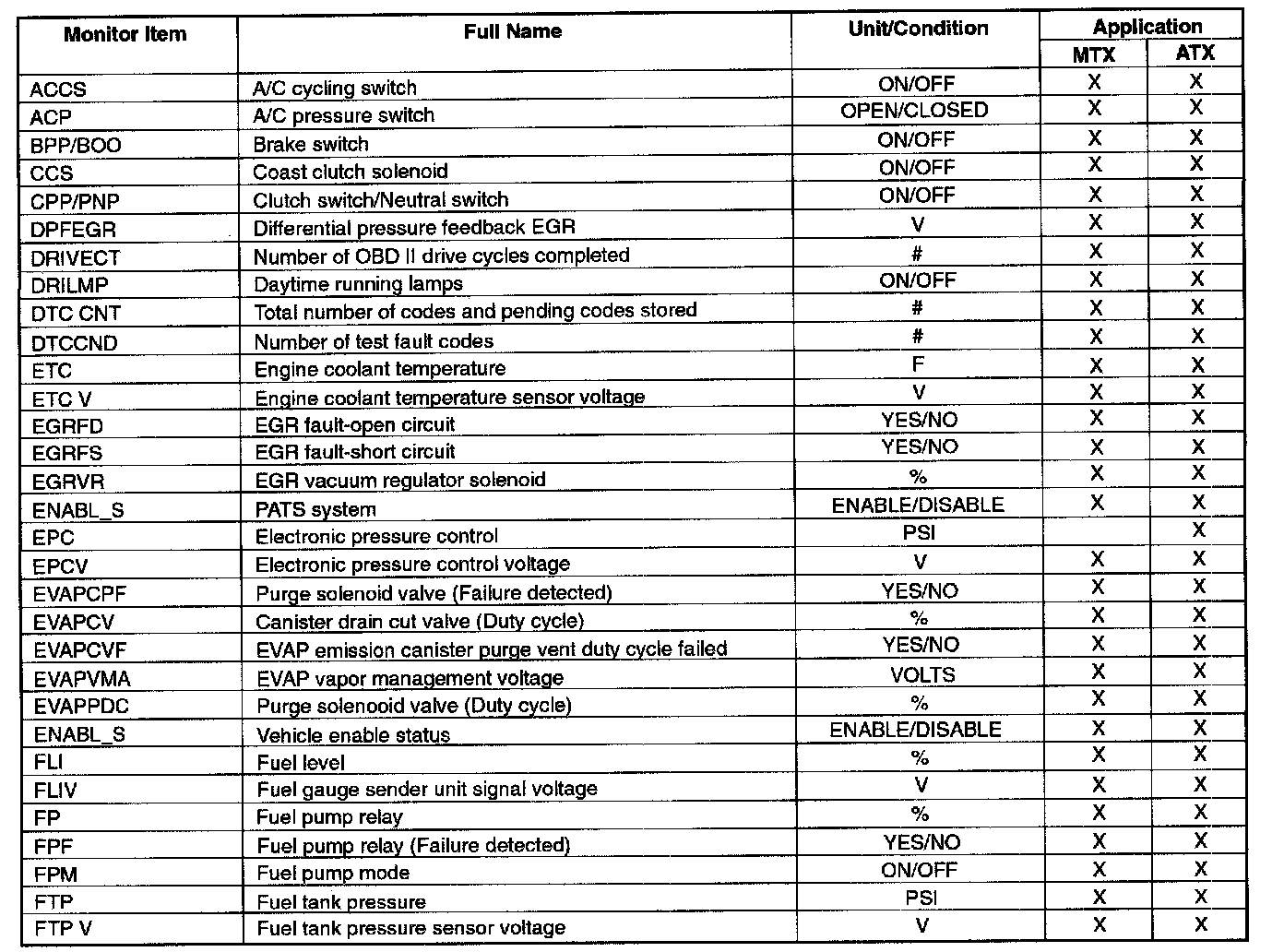 PID/DATA MONITOR ITEM TABLEPID/DATA Monitor Table Part 1: