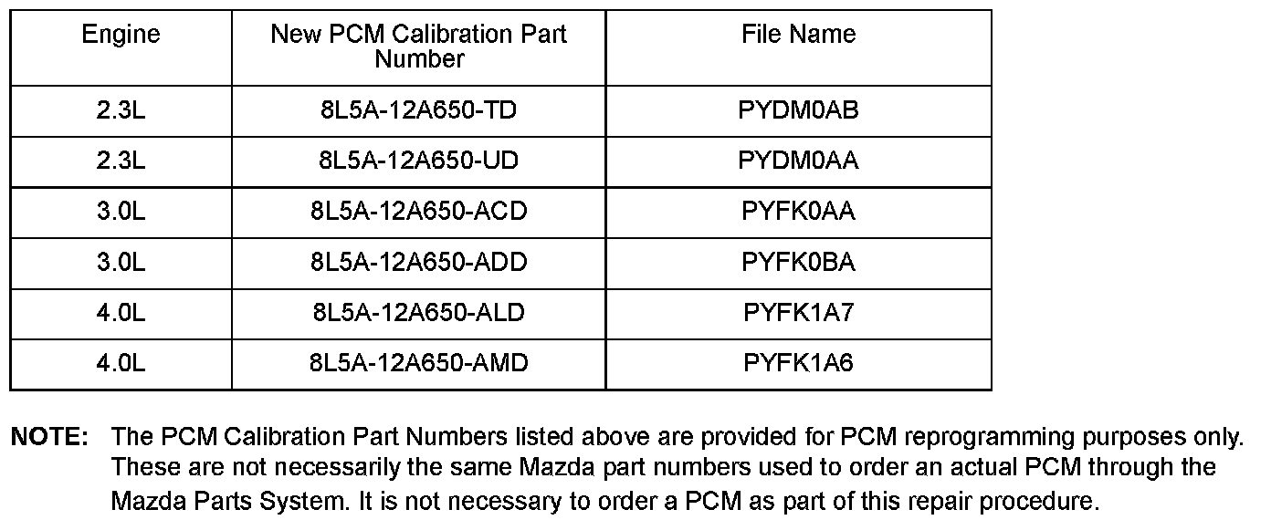 ^ Please be aware that PCM calibration part numbers and file names listed in any Service Bulletin may change due to future releases of IDS software, and additional revisions made to those calibrations for service related concerns.