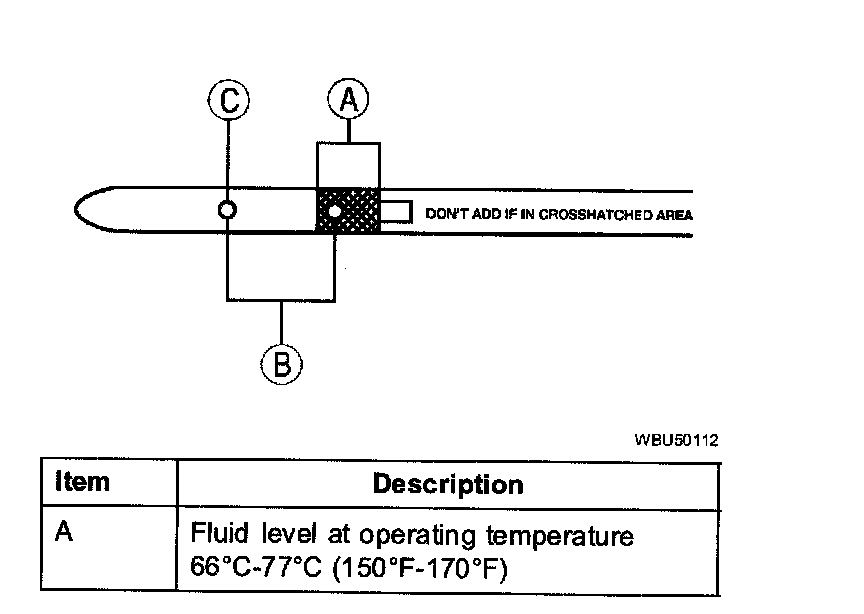 The fluid level reading on the indicator differs from operating and ambient temperatures. The correct reading should be within the normal operating range. Under normal circumstances, check the fluid level during normal maintenance. If the transmission starts to slip, shift slowly, or has signs of fluid leaking, check the fluid level and repair any leak(s).