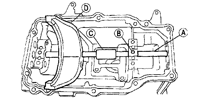 4. Position the (B) detent ball and spring, the (C) shift gate, the (D) shift fork and spring and install the (A) third/fourth shift rail.