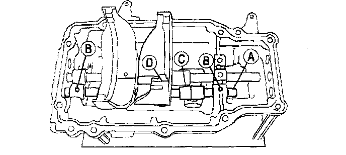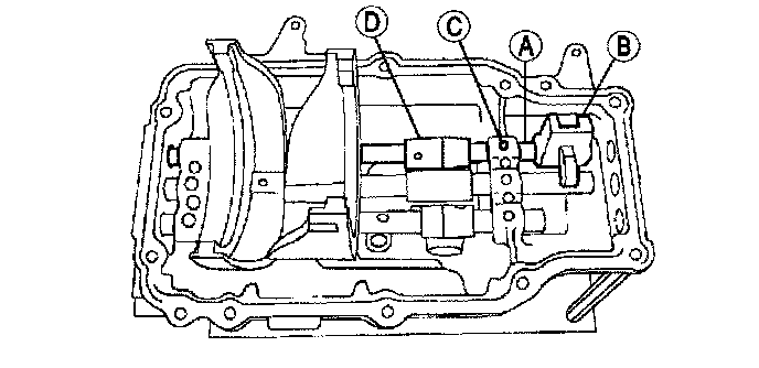 5. Position the (B) detent ball and spring, the (C) shift gate, the (D) shift fork and spring and install the (A) first/second shift rail.