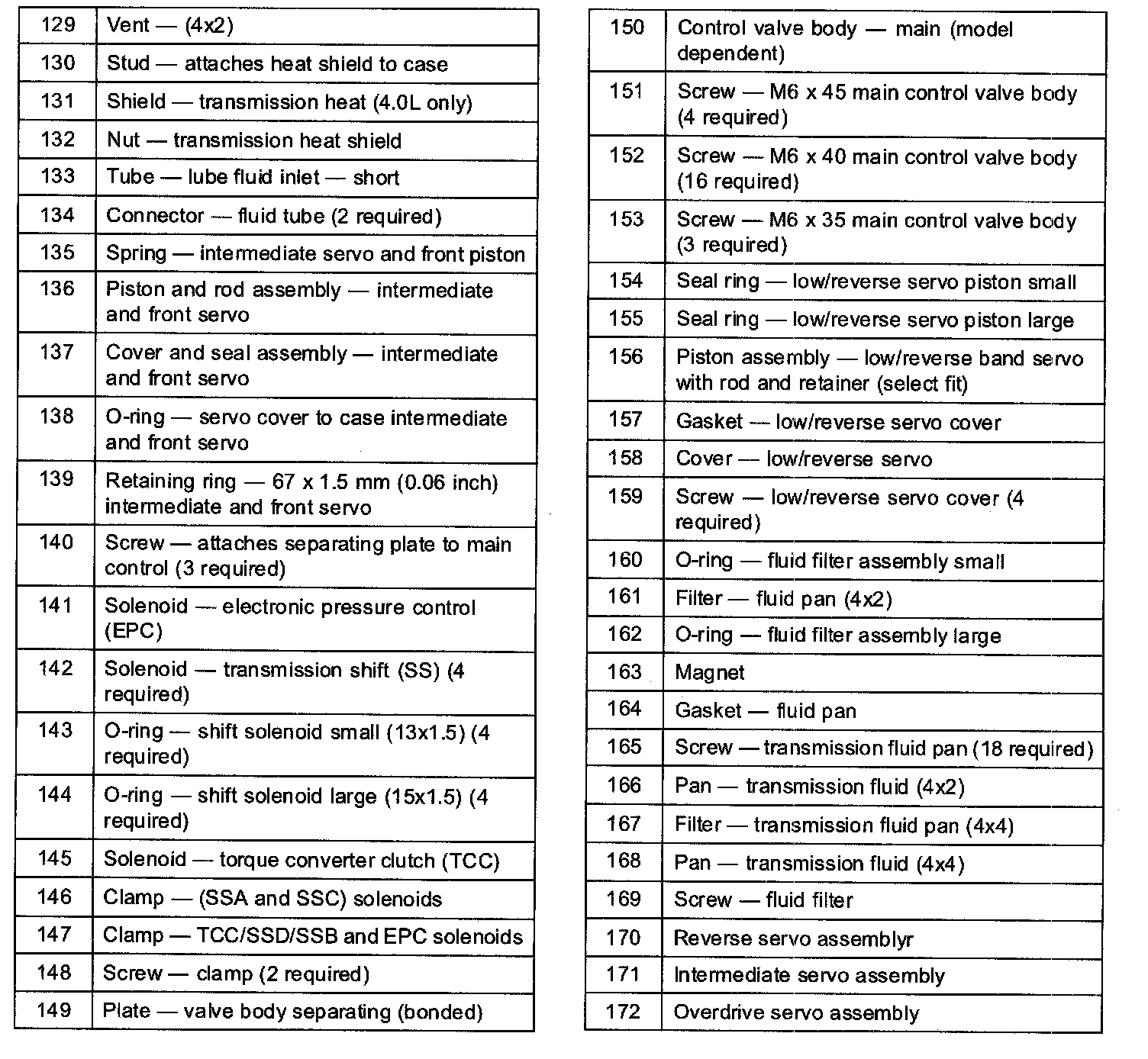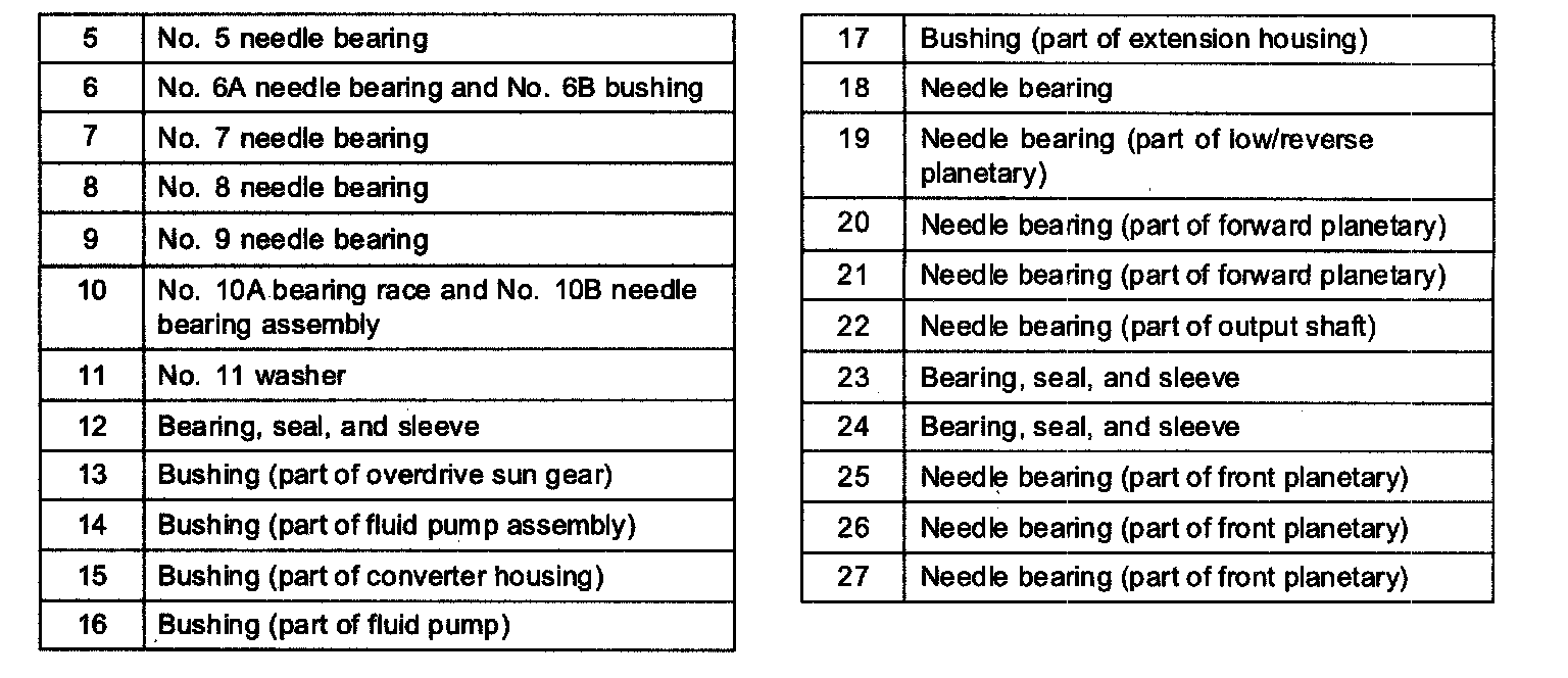 Power is transmitted from the torque converter to the planetary gearsets through the input shaft. Bands and clutches are used to hold and drive certain combinations of gearsets. This results in five forward ratios and one reverse ratio, which are transmitted to the Output shaft and differential.