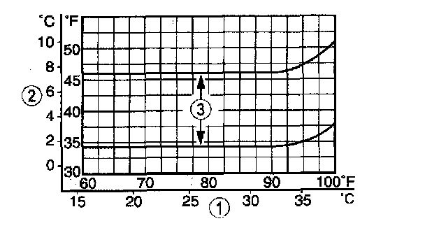 3. The system performance is acceptable when the center A/C register discharge temperature falls between the upper and lower limits shown.