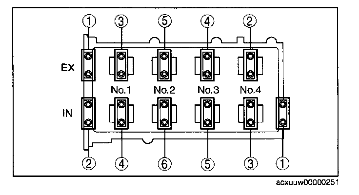 3. Install the camshaft caps and temporarily tighten the camshaft cap bolts evenly in two or three passes, and then tighten the camshaft cap bolts using the following two steps, in the order shown in the figure.