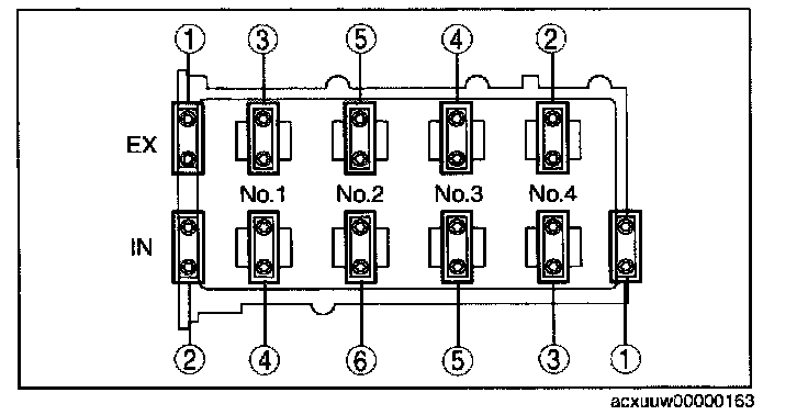 18. Loosen the camshaft cap bolts in two or three passes in the order shown in the figure and remove the camshaft cap.