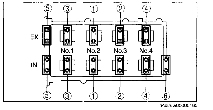 24. Install the camshaft caps and temporarily tighten the camshaft cap bolts evenly in two or three passes, and then tighten the camshaft cap bolts in two passes, using the following two steps and in the order shown in the figure.