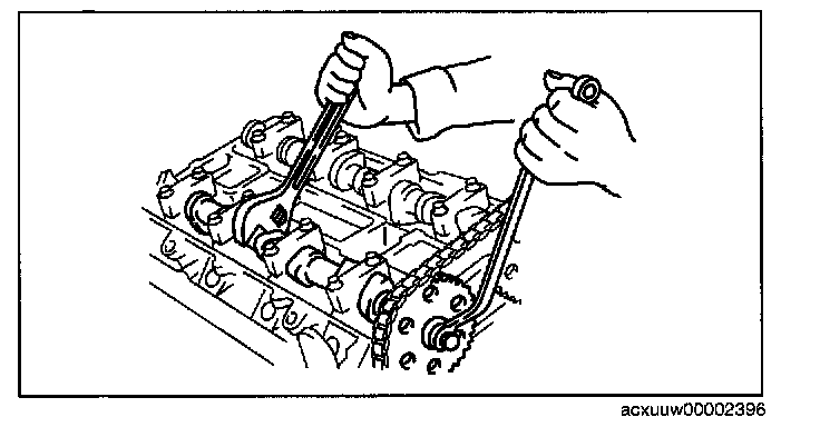 (2) Rotate the exhaust camshaft clockwise using a suitable wrench on the cast hexagon and loosen the tension on the timing chain.