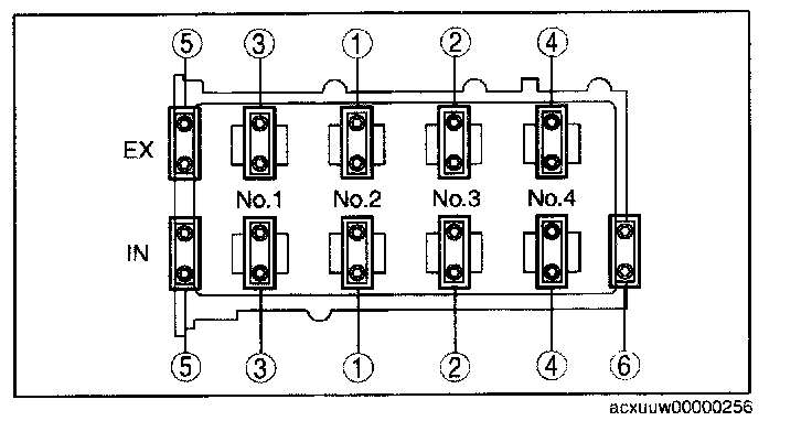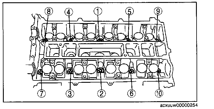 Install the camshaft caps and temporarily tighten the camshaft cap bolts evenly in two or three passes, and then tighten the camshaft cap bolts using the following two steps, in the order shown in the figure.
