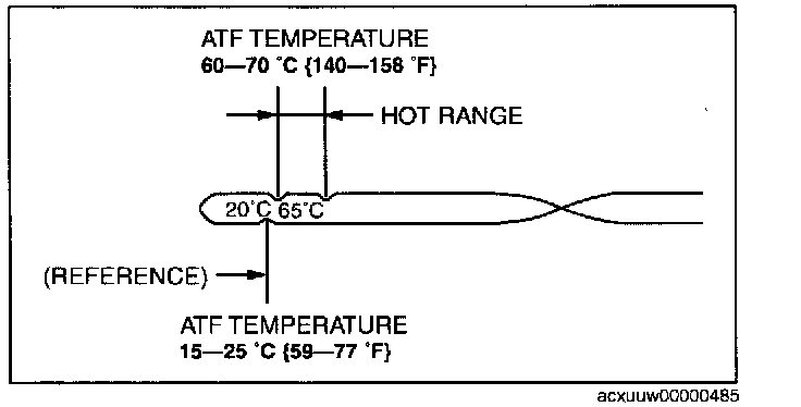 7. Verify that the ATF level is in the HOT range (65° C (149° F)) while the engine is idling.