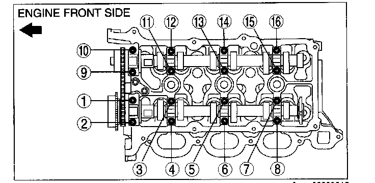 ^ The cylinder head and the camshaft bearing caps are numbered to make sure they are reassembled in their original position. When removed, keep the bearing caps with the cylinder head they were removed from. Do not mix the caps.