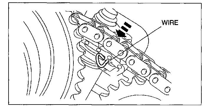 4) Remove the retaining wire inserted into the camshaft timing chain tensioner (RH).
