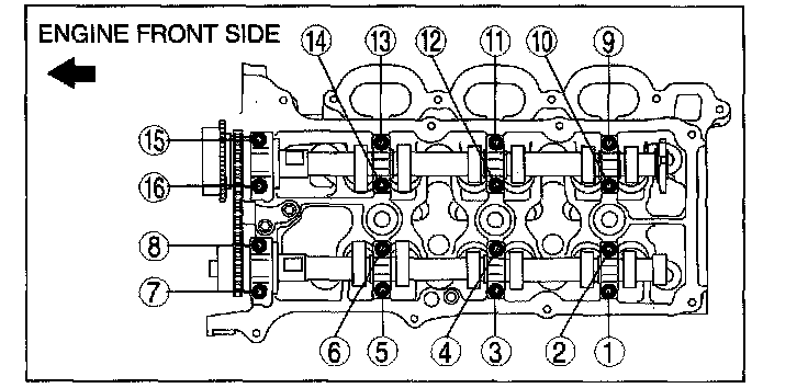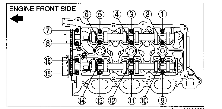 3) Install the RH bank camshaft caps and temporarily tighten the camshaft cap bolts evenly in the order shown in several passes.