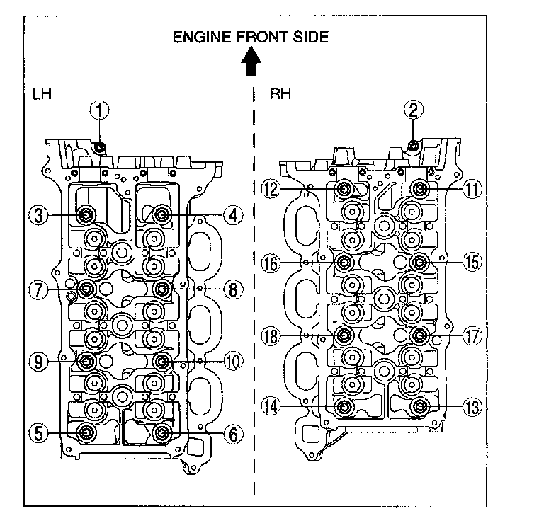 14. Loosen the RH bank camshaft cap bolts in several passes in the order shown in the figure and remove the camshaft cap.