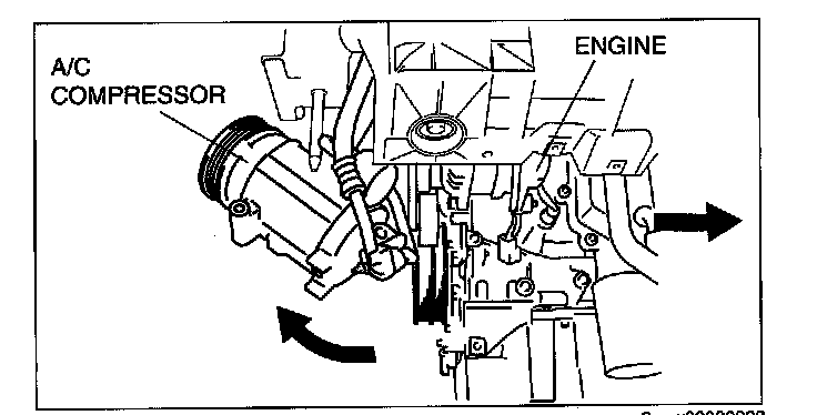 ^ When lowering the engine, slightly move it to the left side of the vehicle to set the A/C compressor out of the way.