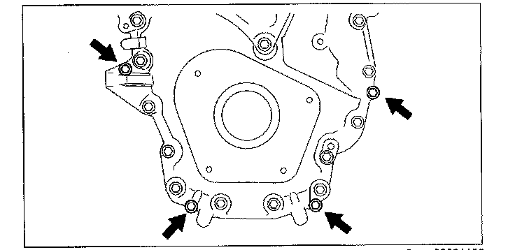 1) Tighten the bolts one turn at a time in a crisscross pattern until the engine front cover-to-cylinder block seal is released.