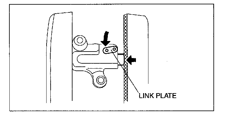 6. Insert an approx. 1.5 mm (0.059 in) thick wire or paper clip where the link plate hole and the tensioner body hole overlap to fix the link plate and lock the plunger.
