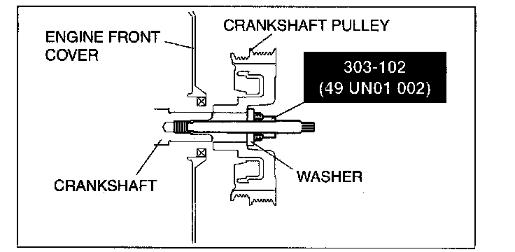 1. Remove the washer from the crankshaft pulley lock bolt, install a suitable spacer (thickness: approx. 14 mm (0.55 in), diameter: approx. 30 mm (1.18 in)), (similar to front shock absorber lower nut) to the crankshaft pulley lock bolt, and install the crankshaft pulley lock bolt to the crankshaft.