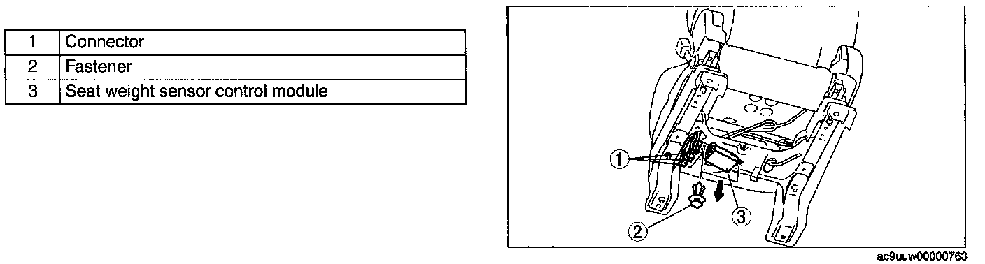 SEAT WEIGHT SENSOR CONTROL MODULE REMOVAL/INSTALLATIONCAUTION: When the seat weight sensor control module is replaced with a new one, perform the seat weight sensor calibration using the M-MDS. (See SEAT WEIGHT SENSOR CALIBRATION.)