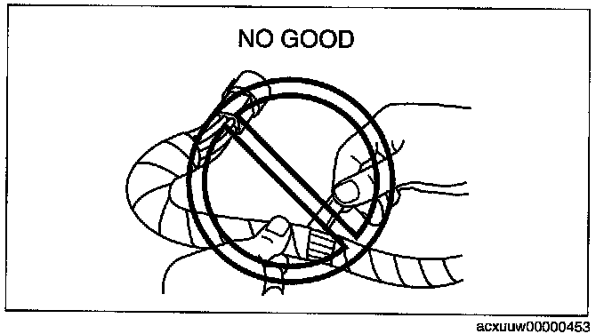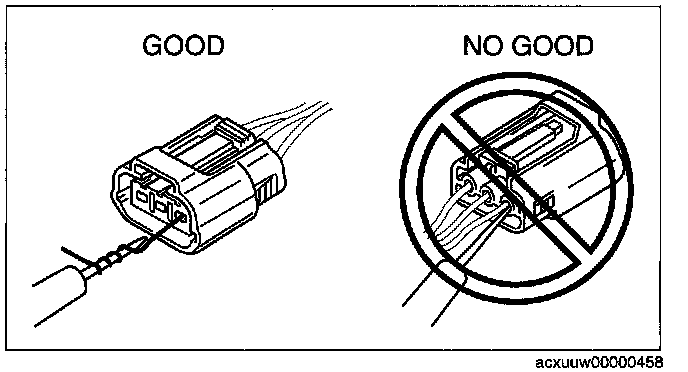 - When a tester is used to inspect for continuity or measuring voltage, insert the tester probe from the wiring harness side.