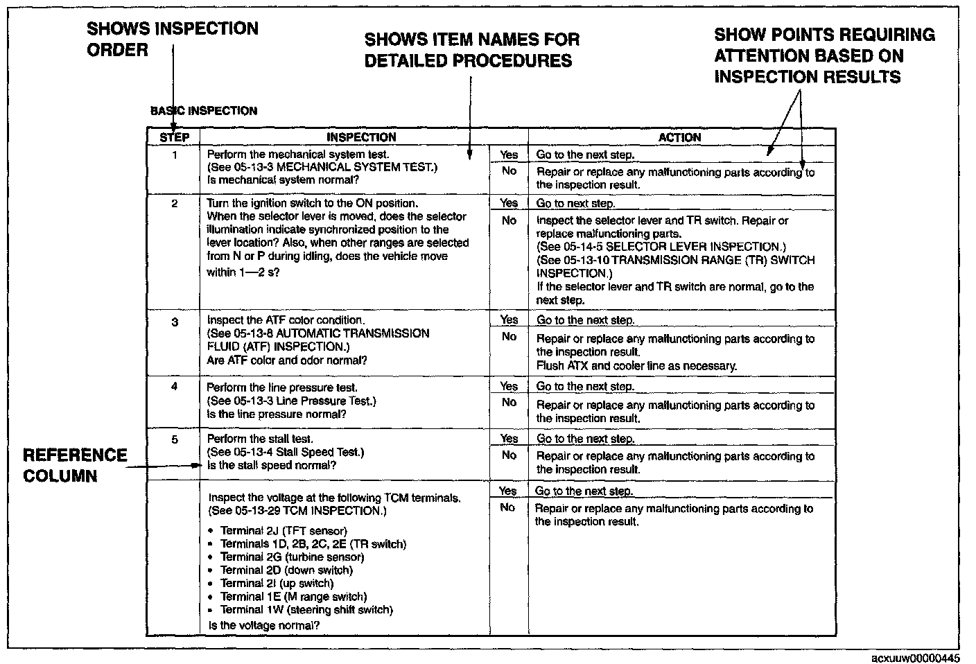 - Although inspections and adjustments are performed according to the reference column procedures, if the cause of the malfunction is discovered during basic inspection, continue the procedures as indicated in the action column.