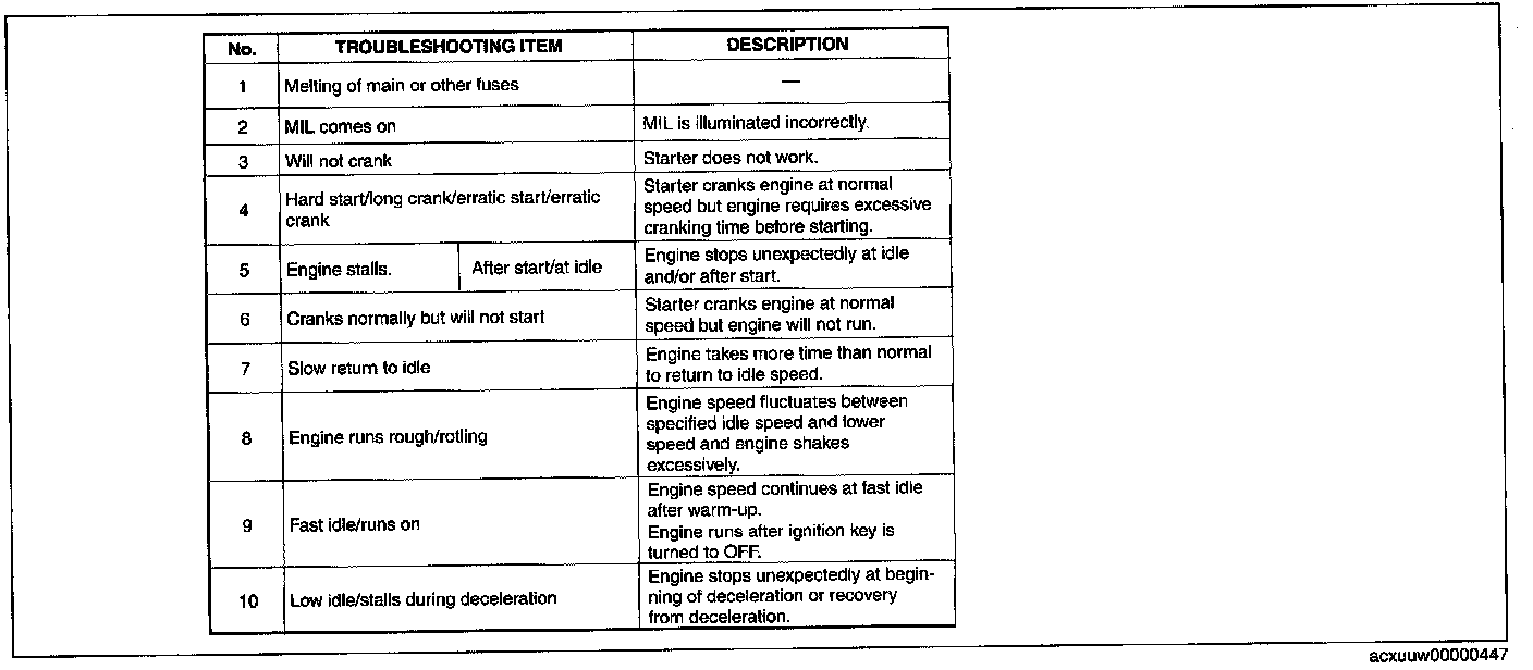 - Symptom troubleshooting shows diagnostic procedures, inspection methods, and proper action to be taken for each trouble symptom.