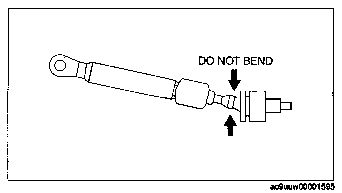 ^ Bending the selector cable in the manner shown in the figure will damage the cable and it may become loose when shifted. When installing the selector cable, hold it straight.