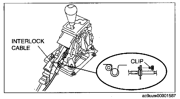 14. Fit the interlock cable in the U-groove in the selector lever base plate and install the clip.