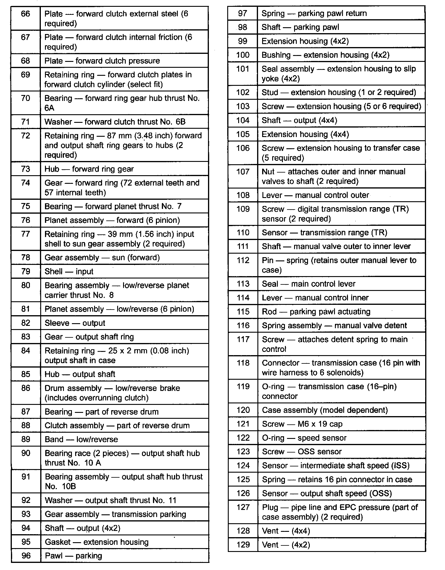Power is transmitted from the torque converter to the planetary gearsets through the input shaft. Bands and clutches are used to hold and drive certain combinations of gearsets. This results in five forward ratios and one reverse ratio, which are transmitted to the output shaft and differential.