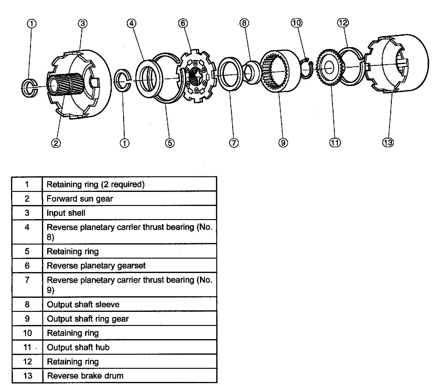 ^ The pinions of the reverse planetary gearset drive the output shaft ring gear and output shaft hub which is splined to the output shaft.