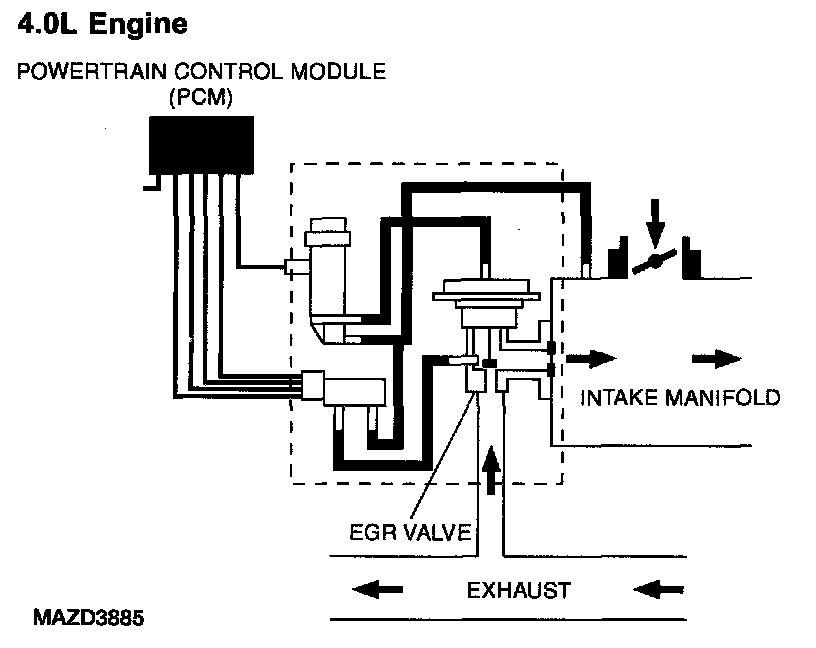 EGR SYSTEM DESCRIPTION- The 4.0L engine, the PCM controls the EGR vacuum regulator solenoid. The EGR vacuum regulator solenoid controls the vacuum to the EGR valve. When the EGR valve opens, exhaust gas flows to the intake manifold to be returned to the combustion cycle. The differential pressure feedback EGR system monitors the flow and returns a signal to the PCM.