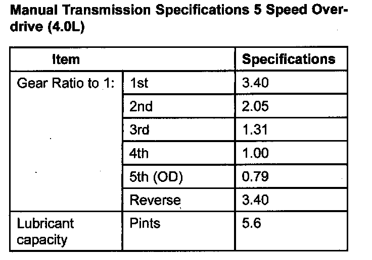Manual Transmission Specifications 5 Speed Overdrive (4.0L)