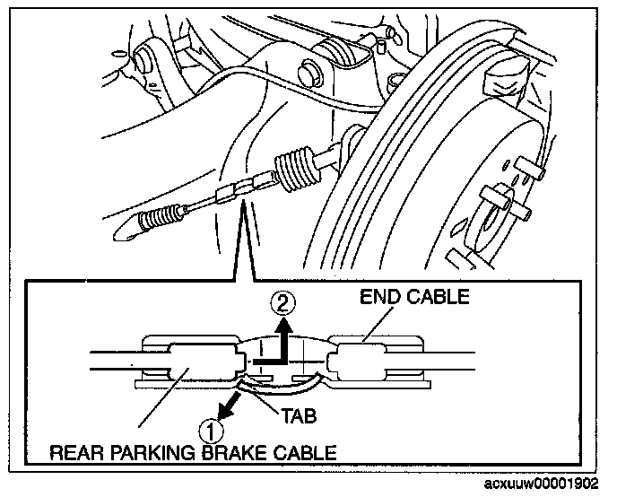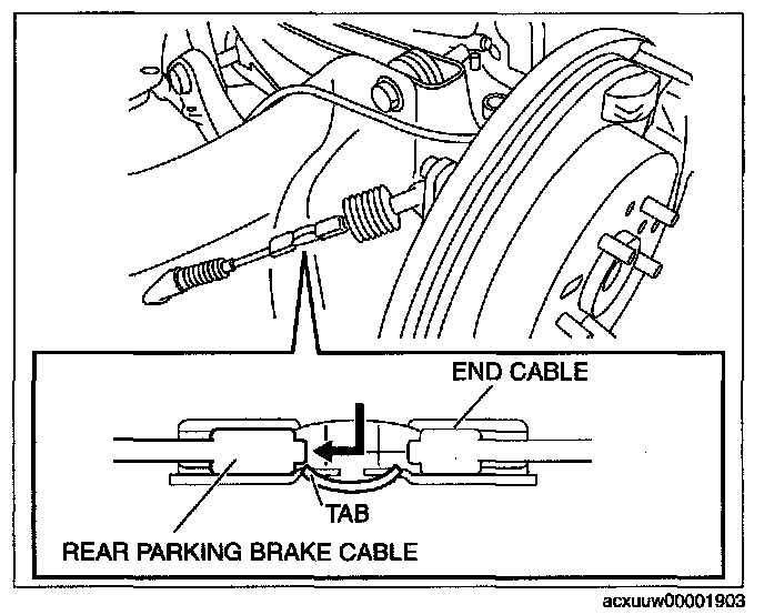 2. Verify that the end cable tab (rear parking brake cable side) is attached properly to the rear parking brake cable end.