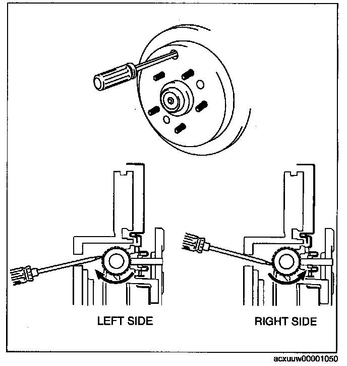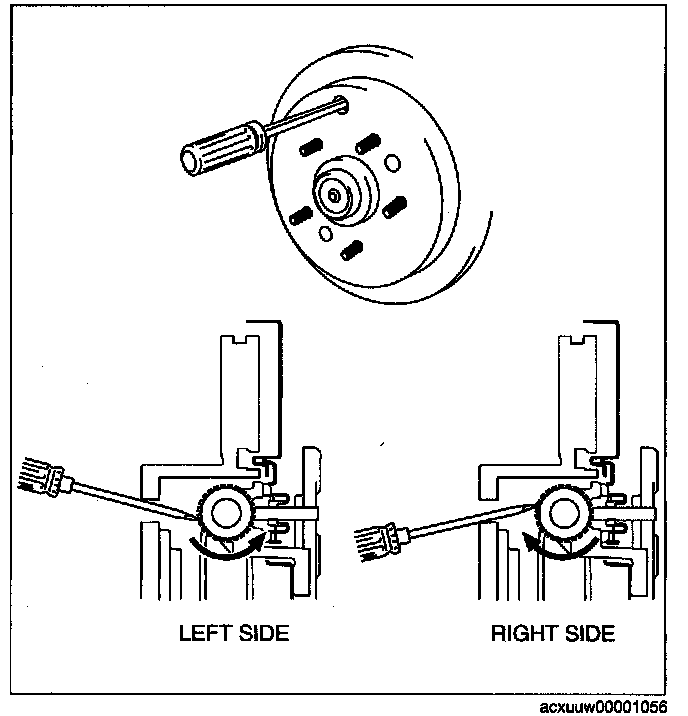 1) Insert a flathead screwdriver into the service hole and turn the adjuster in the direction of the arrow to expand the parking brake shoe until the disc plate cannot rotate.