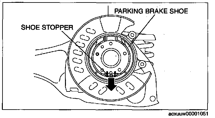 1. Pull the parking brake shoe downward and disengage it from the shoe stopper.