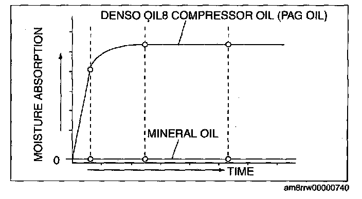 - DENSO OIL8 compressor oil (PAG oil) has a higher moisture absorption efficiency than the previously used mineral oil. If moisture mixes with the compressor oil, the refrigerant system could be damaged. Therefore, install caps immediately after using the compressor oil or removing refrigerant system parts to prevent moisture absorption.