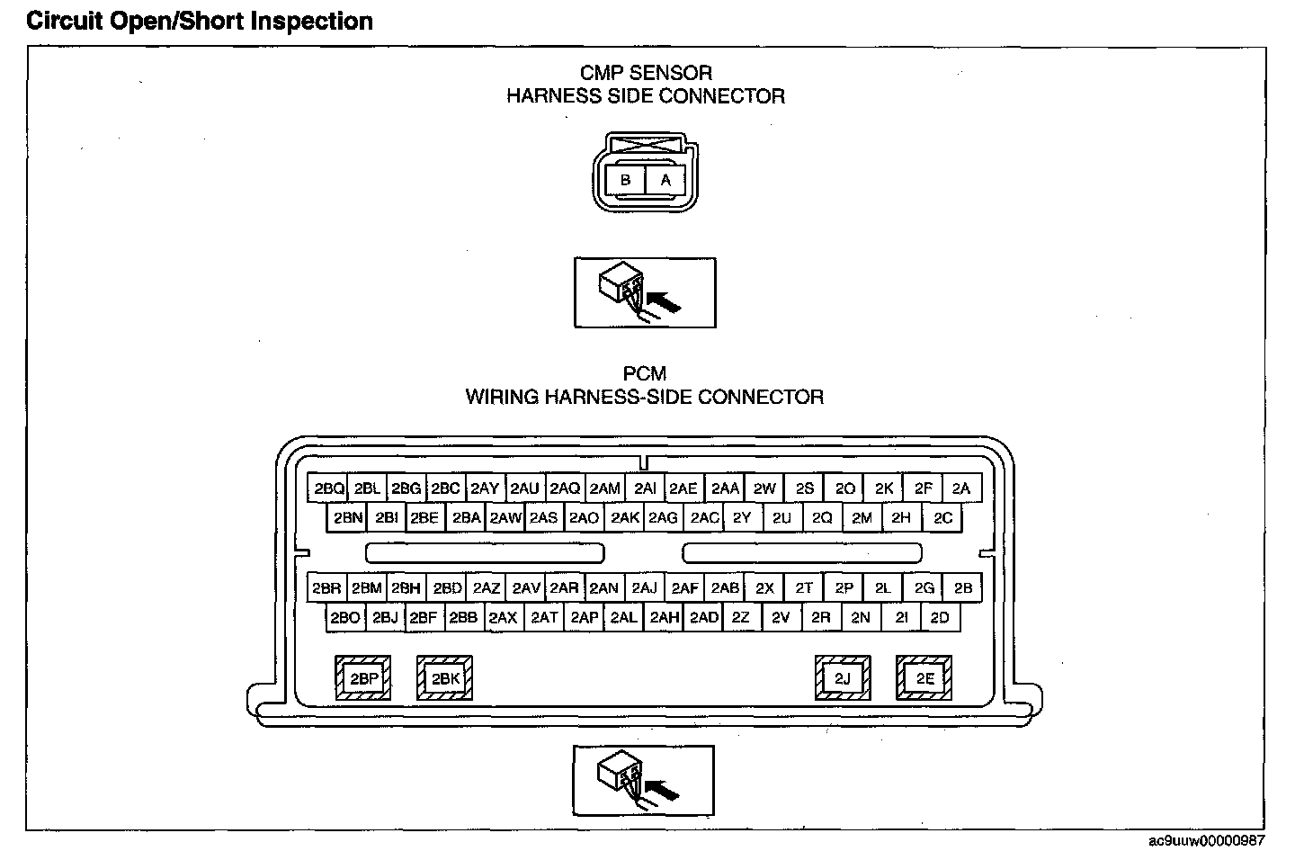 - CMP sensor (LH) terminal A and PCM terminal 2AB