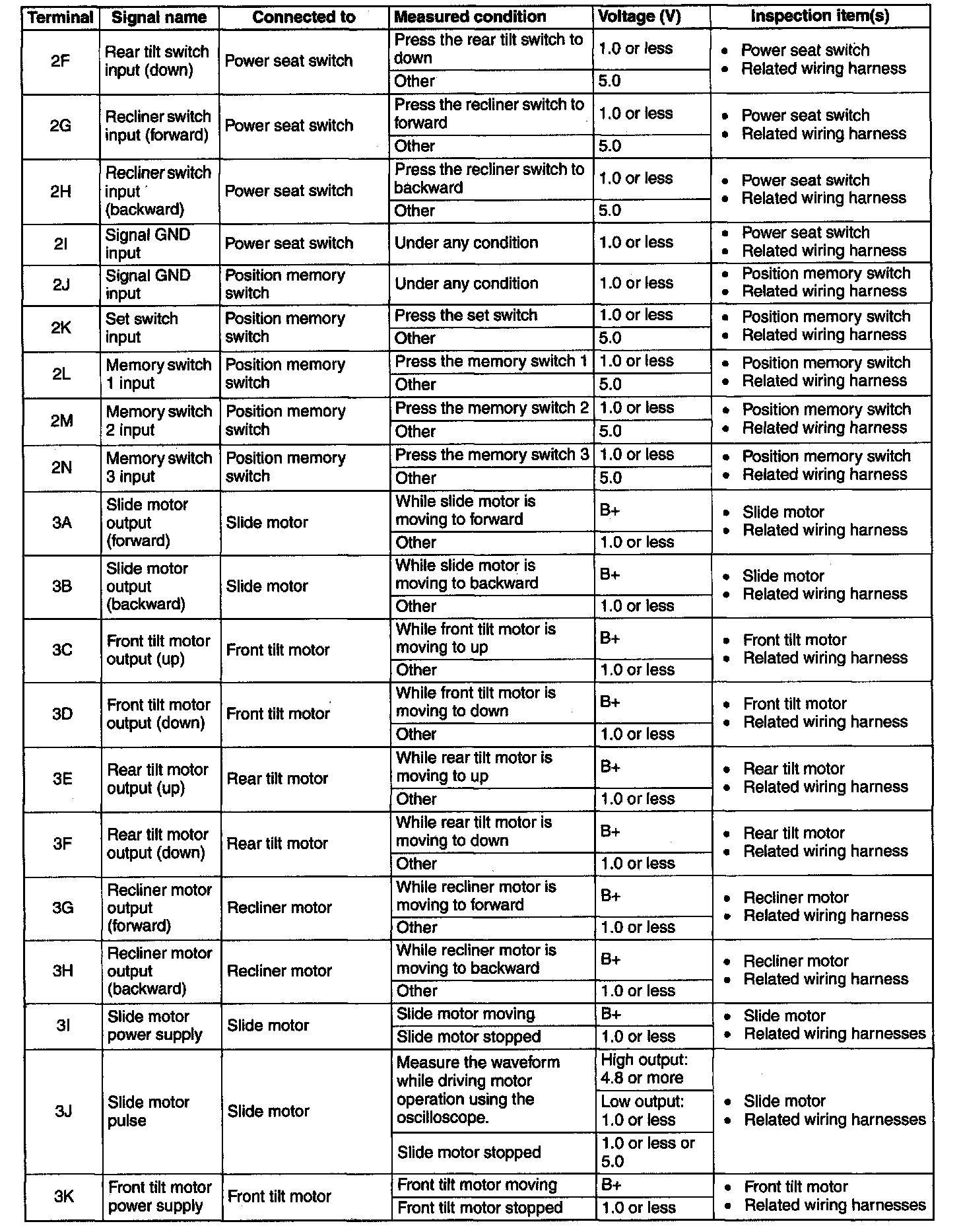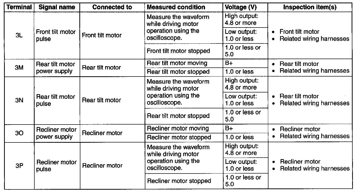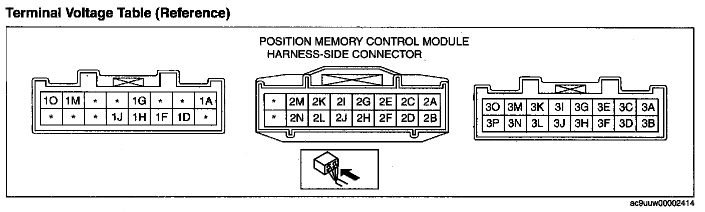 POSITION MEMORY CONTROL MODULE INSPECTION1. Measure the voltage at each terminal is as indicated in the Terminal Voltage Tables.