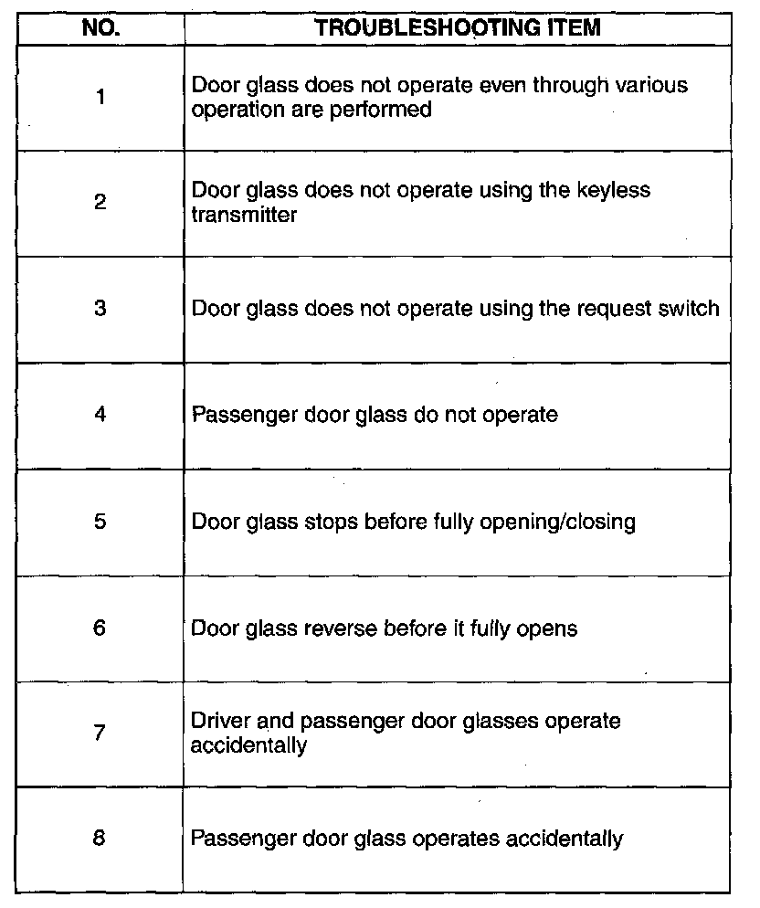 Symptom Troubleshooting Chart [Power Window System (Exterior Open/Close Function)]: