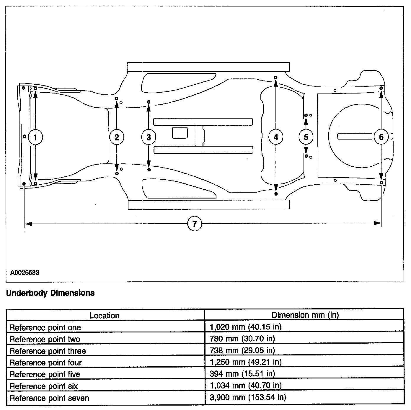 2. All the dimensions are measured between the centers of the existing holes in the underbody unless otherwise specified.