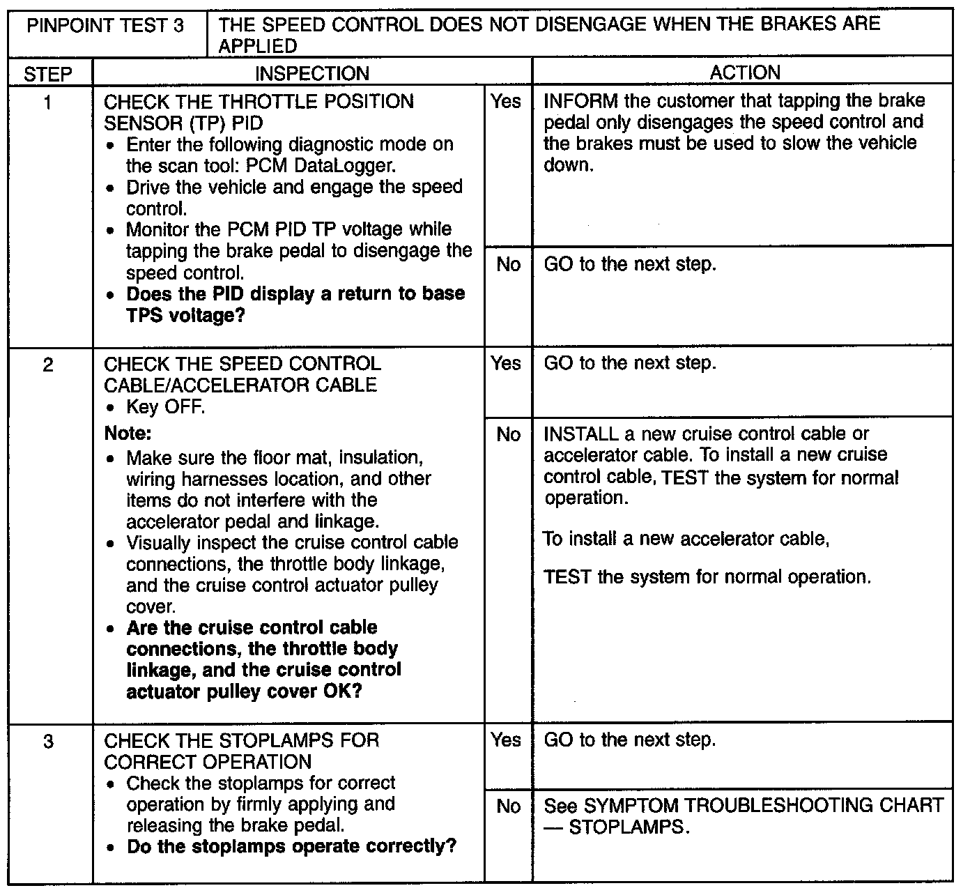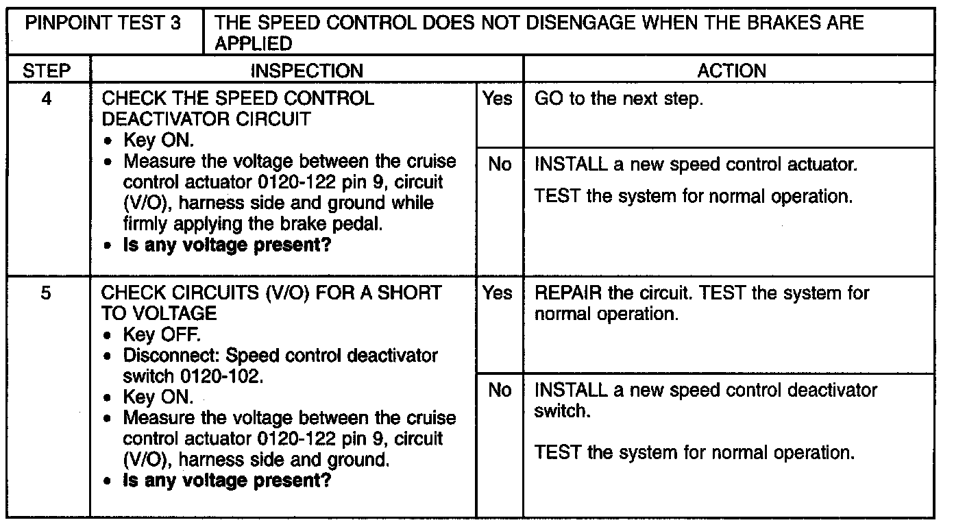 Pinpoint Test 3: The Speed Control Does Not Disengage When The Brakes Are AppliedNOTE: Tapping the brake pedal deactivates the speed control. It is necessary to apply the brakes in order to slow the vehicle down.