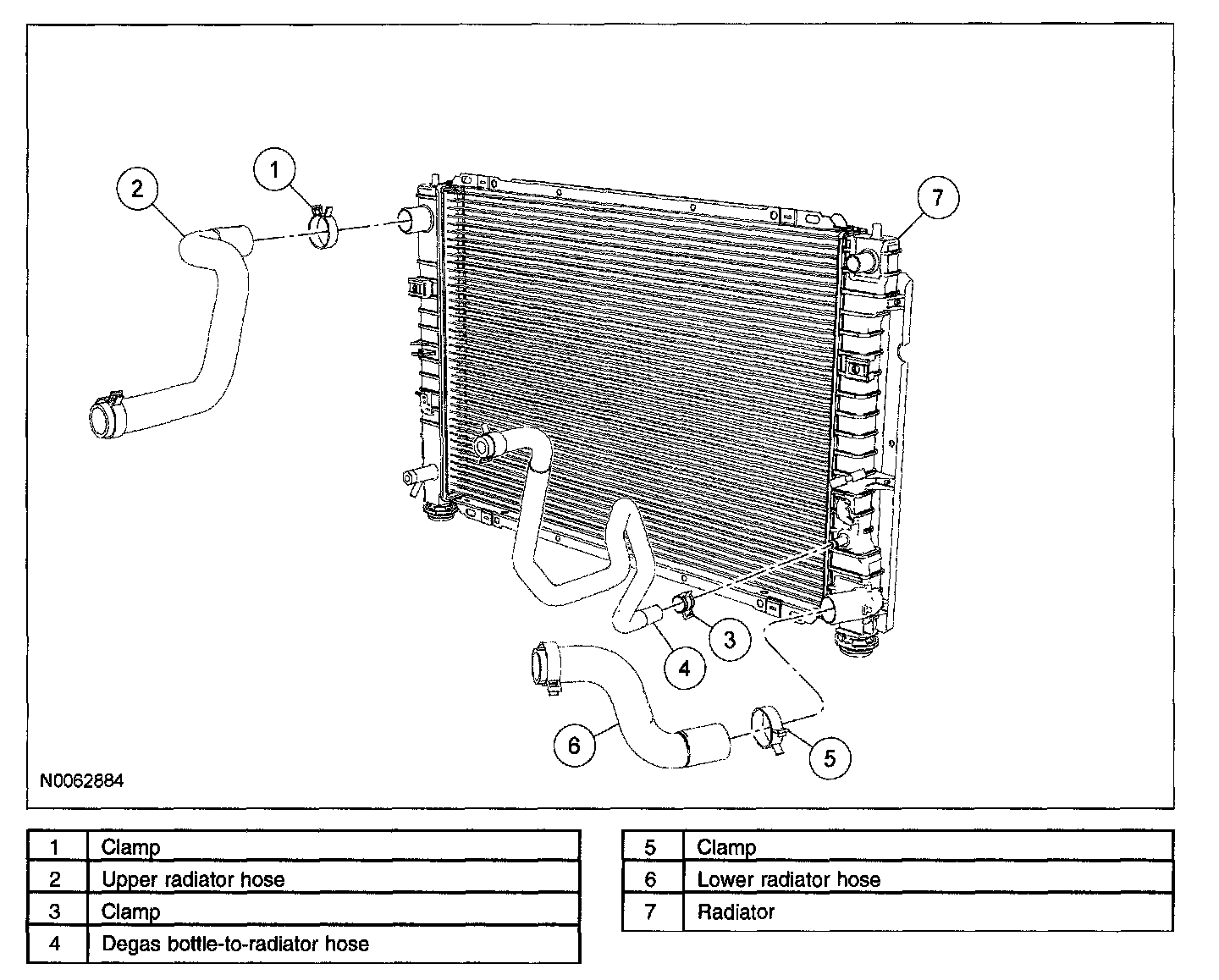 4. Disconnect the lower degas bottle-to-radiator hose from the radiator.