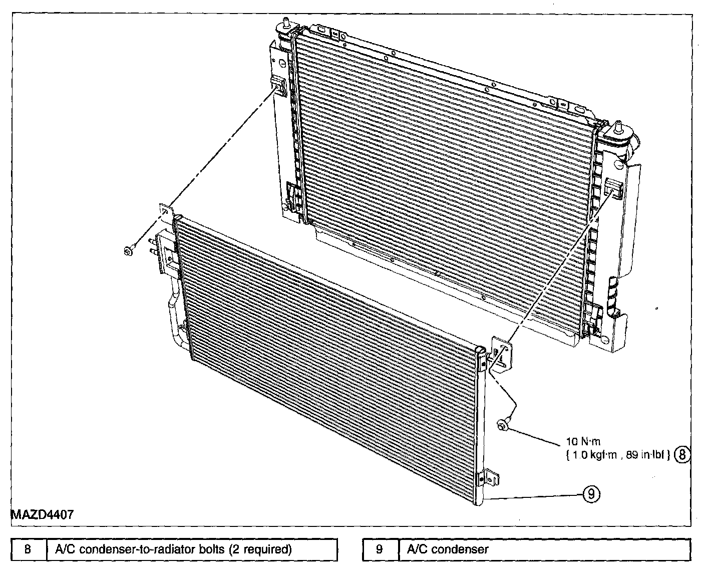 6. Remove the 2 A/C condenser-to-radiator bolts and position aside the A/C condenser from the radiator.